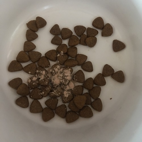 사료와 함께 줄 때도 있고 간식을 으깨고 섞어서 줄때도 있습니다.